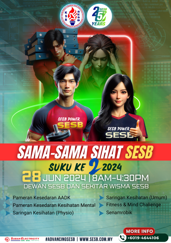 Adalah dimaklumkan bahawa satu Program “Sama-Sama Sihat” suku Ke-2/2024 anjuran bersama Bahagian Sumber Manusia & Kelab Sukan & Rekreasi (KSR) akan diadakan seperti ketetapan berikut: